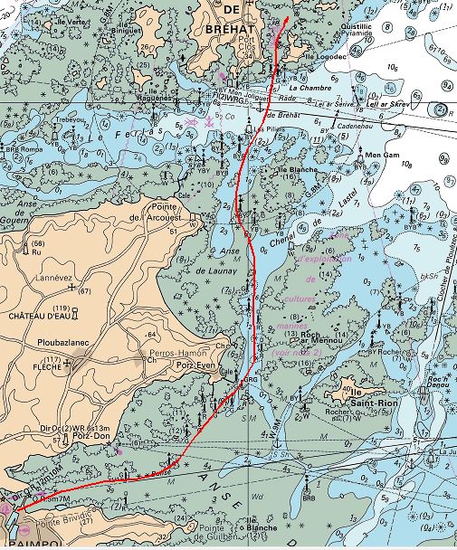 Peu de vent, donc tout moteur et cette fois pas question de quitter la carte et le paysage des yeux, ce qui n'empechera pas de passer du mauvais côté d'une perche, mais il y avait un voilier pilote devant, bêtement suivi. Il y a peut être du boulot pour reprendre de la rigueur.
