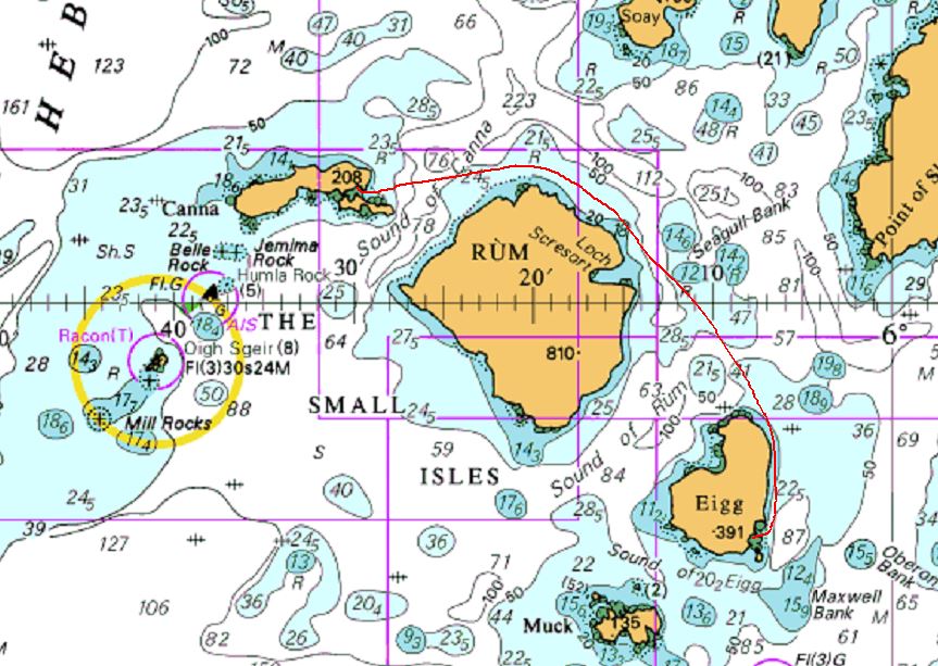 Le 12 juillet enfin, on lève le camp direction Eigg dont on garde d'excellents souvenirs, en snobbant encore une une fois Rum, et avec cette fois la ferme intention de monter en haut du Sgurr. Départ tranquille, mais effet tunnel dans le sound of Rum, entre Rum et Eigg, et du coup on se retrouve au près bon plein quelque peu surtoilé, et échanges vifs au sein de l'équipage en faisant voler les expressions "anticipation", "vitesse", "ferry", etc...
