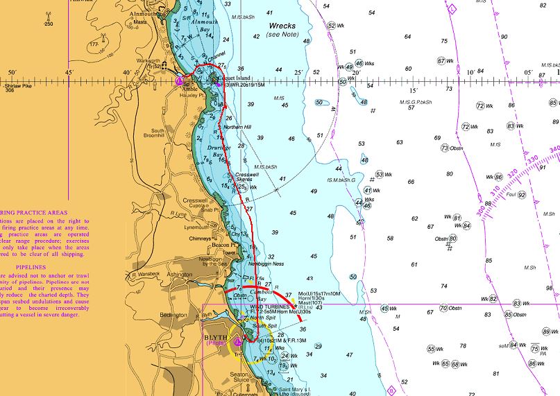 Dernière étape avant l'Ecosse. Après une pêche "miraculeuse" avant Coquet Island, arrivée olé olé au début du flot dans un chenal coté à 0,1 m. Poussé par une sorte de mascaret, modeste, le sondeur est descendu à 0,8m, et très probablement le fond de la coque a été bien nettoyé.