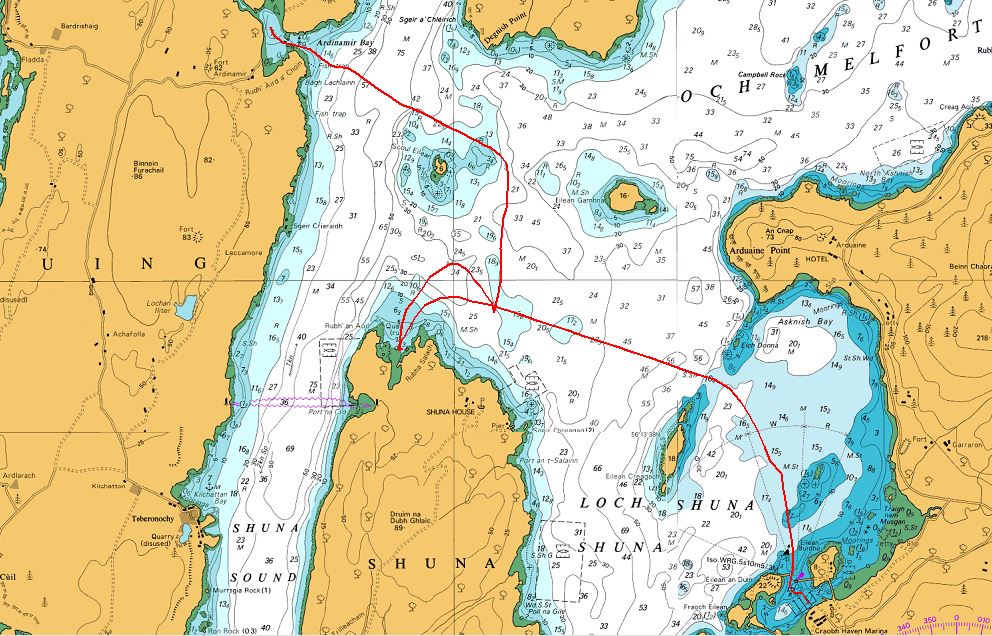 Nous profitons du vent faible pour une tentative de pêche à la voile (si, si!) mais sans l'ombre d'un succès. Heureusement il y a la pêche à pied à Shuna!