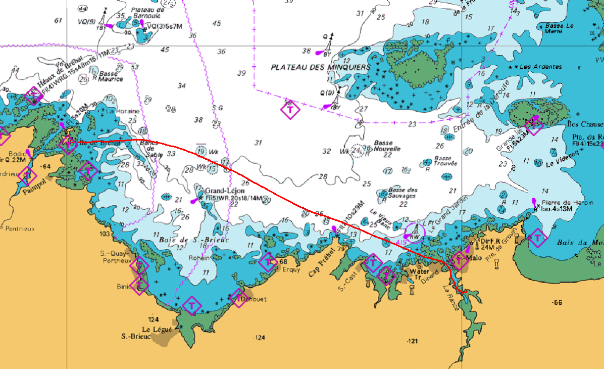 N-ième version de cette étape, la nouveauté étant le parc éolien de Saint Brieuc, qui ne paraissait pas très productif ce jour là. Moins de moteur qu'annoncé par le routage mais vent un peu plus poussif. Impression de se trainer, d'autant que le loch sous estime la vitesse d'au moins 30%, ce qui semble indiquer de la salissure sur la sonde.