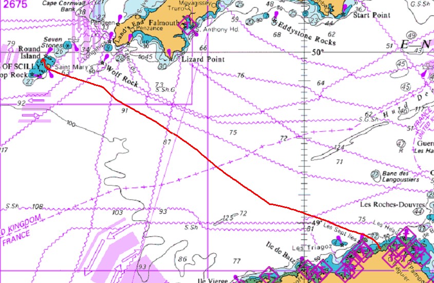 Une traversée à classer parmi les bonnes, mer belle sauf cahotique à l'arrivée, mais c'est la norme autour des Scillies. Un peu de moteur pour contourner Rouzik, puis 7 heures de spi à 6-7 noeuds, qu'on a eu la mauvaise idée d'affaler avant le rail montant, parce que les éventuelles manoeuvres d'évitement, parce que en étant à 90° du vent apparent en pointant trop vers l'ouest, on "rallongeait" la route, etc, etc. Mais, comme prévu le vent virant à l'est voire sud est, on a terminé vent arrière et donc tangonnage du génois (20-25 noeuds à la fin, mais pas ressenti avant de remonter le vent à l'intérieur de l'archipel), alors que si on avait persisté vers l'ouest, on serait resté grand largue sur tout le parcours.