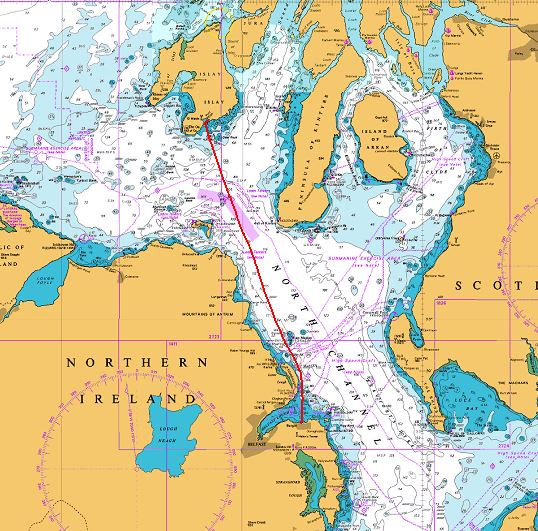 Pour la soixantaine de milles à parcourir pour atteindre Islay, donc a priori une douzaine d'heures, et compte tenu des contraintes de courant dans le North Channel, une étape d'une traite dans une journée n'est pas possible. Donc départ le 7 au soir à l'heure ad hoc pour benéficier au mieux du jusant (le North Channel se vide par le nord). De ce point de vue, ce fut une réussite puisque l'étape n'aura duré que 9 heures avec des pointes à plus de 9 noeuds sur le fond entre Rathling Island el le Mull of Kyntire.