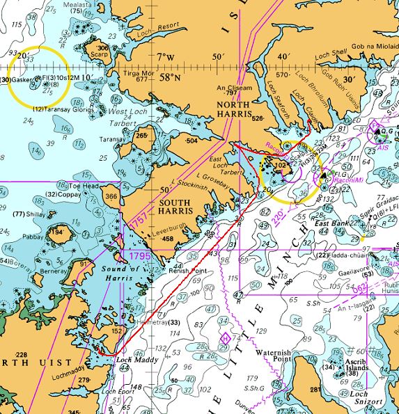 Evidemment c'est la seconde opion qui est retenue, belle navigation vers le Loch Tarbert, magnifique entrée à la voile au près sous génois seul (on croise Saffire qui quitte les lieux après une pause déjeuner), assez peu au gout de la moitié de l'équipage, non moins magnifique faute d'inattention qui nous vaut de passer sur un haut fond (voir le "journal de bord") avec chocs sur la dérive et le safran (et un fusible, un!), larmes, noms d'oiseau, etc, etc pour constater que de marina, point. La réponse à cette situation invraisemblable est dans une lamentable erreur de pagination du Welcome Anchorages 2017. Un rigolo a confondu le East Loch Tarbert de Harris avec celui du Loch Fyne, à l'est du Mull of Kyntire, zone de navigation autrement fréquentée, d'où les 180 places. Ce "détail" aurait dû nous mettre la puce à l'oreille, mais tout à notre obsession de douches....