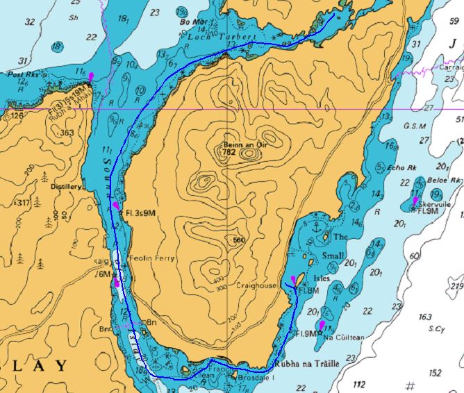 Première partie de l'étape voile et courant favorable dans le Sound d'Islay, de quoi se réjouir. Mais sortie du Loch Tarbert au près, obligeant à serrer la côte, et déclenchant une fois de plus discussions "animées" entre un vieux con nostalgique de la navigation à la voile (puisqu'on est à bord d'une embarcation dont c'est, en principe, le mode de propulsion principal), soucieux de conserver le "savoir faire" par des entrainements récurrents, et une adepte de "l'emmerdement minimum" en échange de quelques litres de gazole. Mais ouf, c'est passé sans être obligé de virer.