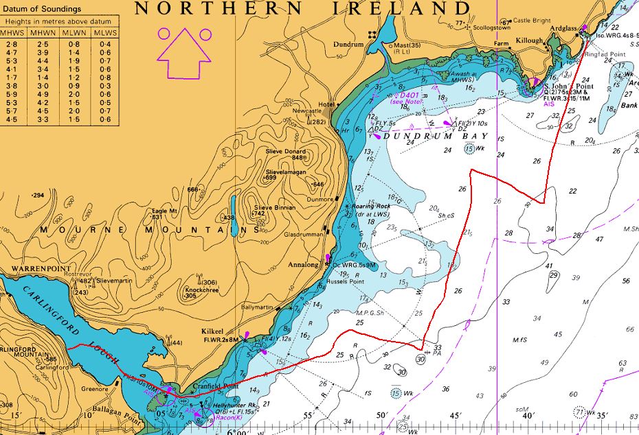 Cela devait être Howth (55 milles), mais encore au près avec des rafales à plus de 20 noeuds, mer clapoteuse dans le nez, on applique un plan B (pas vraiment anticipé) pour Calingford. Il devrait suffire de quelques bords pour arriver si possible avant la renverse, même si pour ce lough le courant n'est pas excessif, contrairement à Strandford Lough.