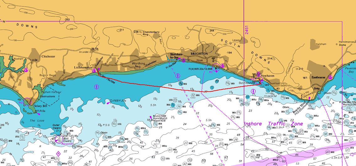 En bon plaisanciers-retraités, pas particulièrement pressés, et donc envisageant des nuits de durée suffisante, le départ était prévu un peu avant que la vase n'empêche de partir, grosso modo vers 8h30. Mais entre insommnie, idée lumineuse et crainte d'être coincé par la vase ou une bonne heure durant par l'interdiction de manoeuvrer dans le port à cause du départ ou de l'arrivée d'un ferry, finalement décollage à 4h30, "en solo". Et grâce à l'idée lumineuse nous aurons profité plus longtemps du vent "pépère" pour une seconde nav %100 voile, en longeant Rampion Offshore Wind Farm (mise en service en 2018, 72 km², pouvant alimenter 300000 foyers), premier maquereau (un peu ridicule en taille), arrivée à la bonne heure à Littlehampton (comme à Rye et Newhaven, il y a une barre à l'entrée), à marée montante, en benissant le faible tirant d'eau.
