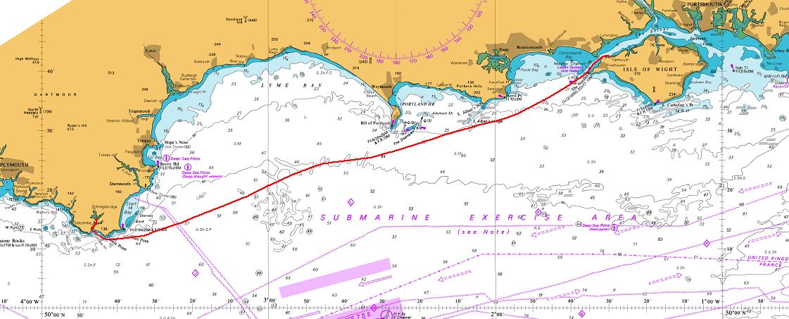 Etape quasiment tout voile, et même du spi une fois sorti du Solent, jusqu'à la fin de journée. Le vent d'est doit se renforcer à 20 noeuds, alors prudence, et tangonnons le génois. En fait le vent ne se lèvera qu'au petit matin, mais la mer sera clapoteuse passée Portland Bill.