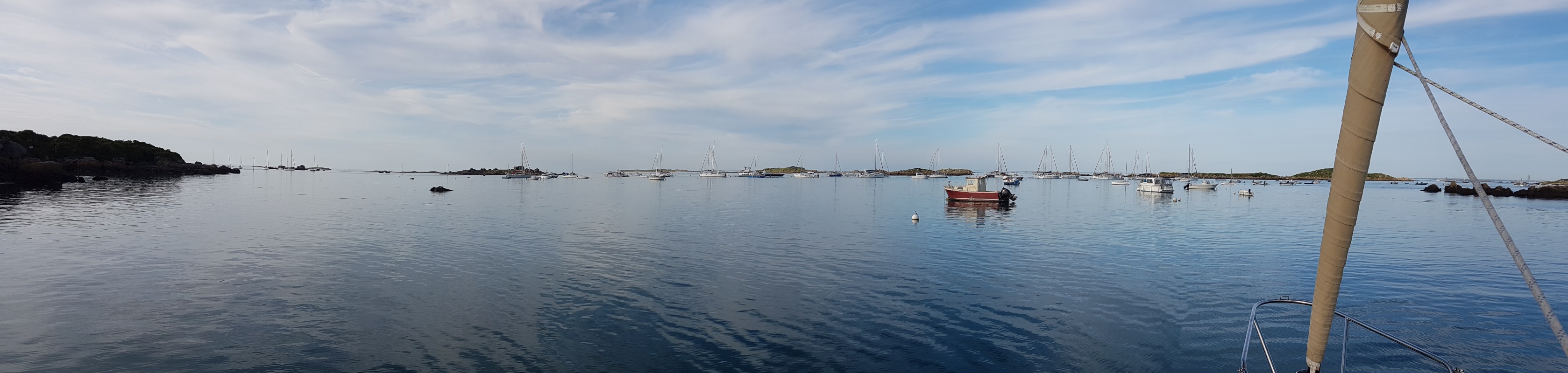 100% moteur au moteur pour se rendre aux Chausey, sur une mer d'huile et en absence totale de houle. Les mouillages du sound étaient bien occupés avec jusqu'à 4 bateaux à couple, et, petit coefficient le permettant, plusieurs avaient été jeter l'ancre au delà du sound.