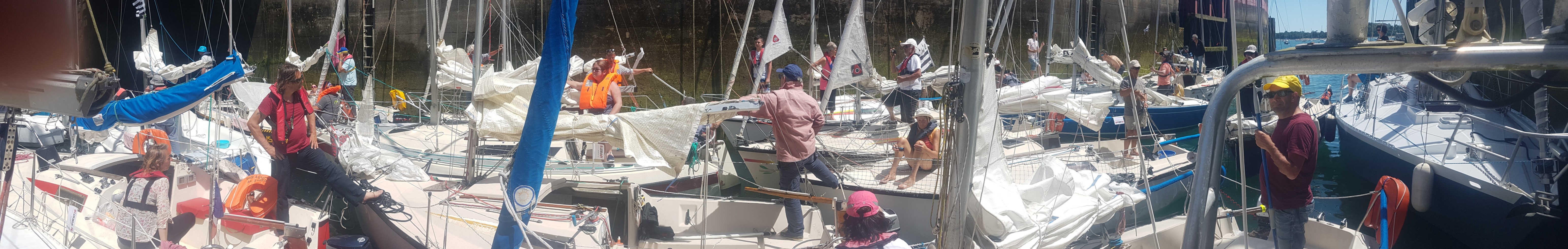Certains n'avaient pas réalisé que le vent venait de l'arrière, et gardant le réflexe d'amarrer l'avant d'abord, ont fait de jolis têtes à queue, ajoutant à la foire d'empoigne. En outre il semblerait que l'organisateur du rassemblement ait demandé aux participants de ne pas éteindre le moteur pendant le sassage. Donc 18 hors bords 2 temps au ralenti pendant 20 bonnes minutes dans un sas profond, le bruit et les particules fines s'en sont donné à coeur joie!
