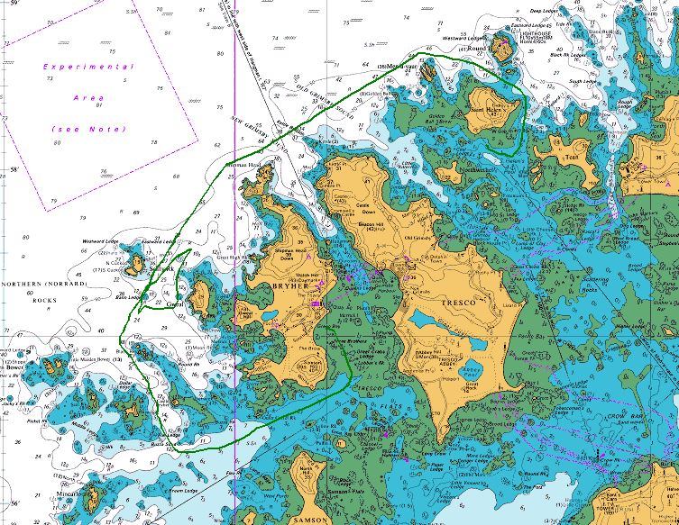 Quitter Bryher à marée haute et prendre le temps d'un plan pêche interdit d'arriver à un mouillage asséchant. Donc il faut un mouillage de pleine eau, va pour Saint Hélen's puisque le vent est faible, pas de houle, et passage à l'extérieur de Bryher, pour la pêche, dont le bilan est 3 heures de moteur, courant dans le nez, pour un lieu fort modeste, et une touche d'un poisson colossal (lieu ?) mais qui ne s'est pas concrétisé.